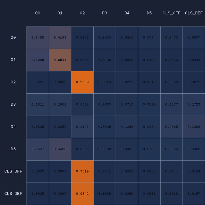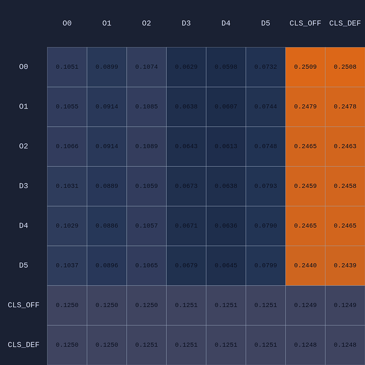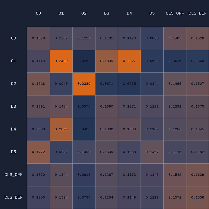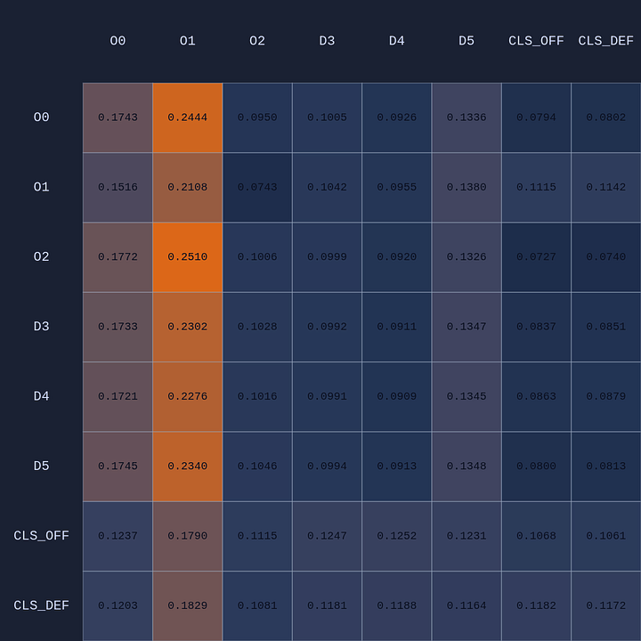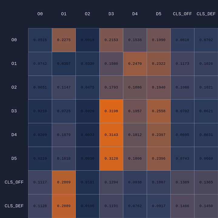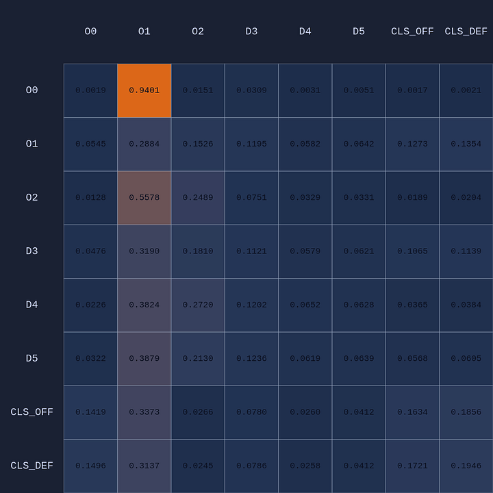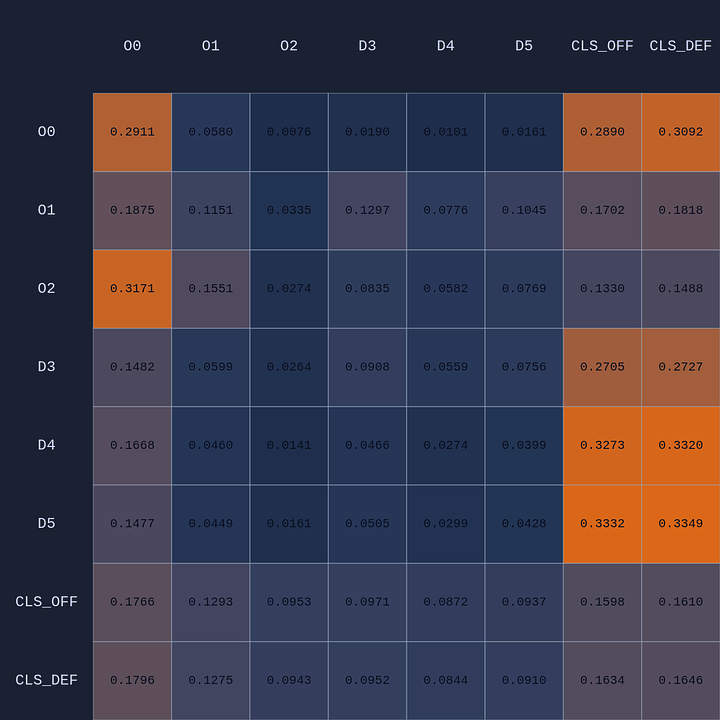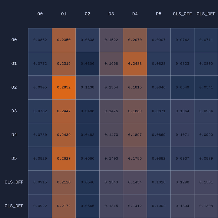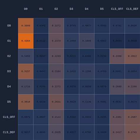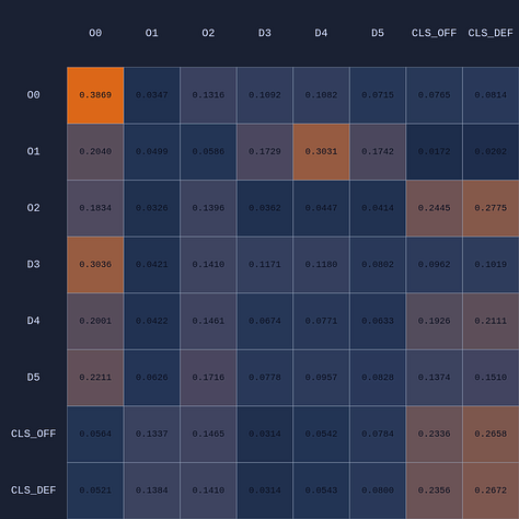 So a couple of cool things have happened. The first and most obvious result of this move is that it opened up O2 for a much more efficient shot (EP=1.08 vs 0.86 previously) and now the highest probability action for O1 is a pass to O2. This policy change is clearly evident in the attention map as we see O1→O2 has suddenly “lit up”. In fact, O1 is now paying more attention to O2 than to itself. Conversely, D5 is now paying relatively more attention to O0 and less to O2 than before, although on average all the defenders are paying high levels of attention to the open shooter compared to their own defensive assignments. There’s something else that’s interesting here…spot it yet? Notice that when D5 moves over to “help” on O0, D4→O1 actually decreases by roughly 50%. Attention is conserved across rows so if more attention is given to one player it must be taken away from some other players!