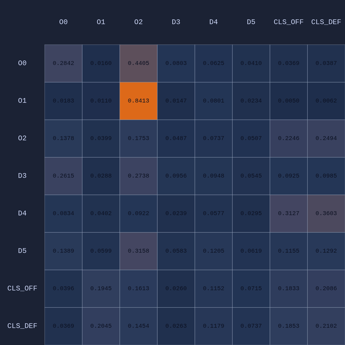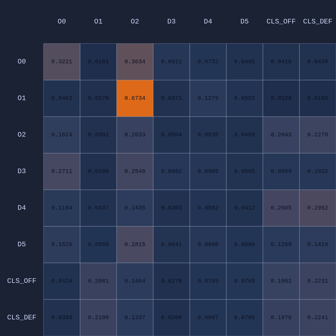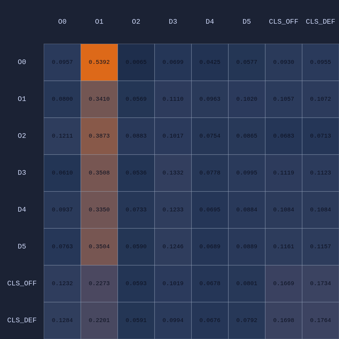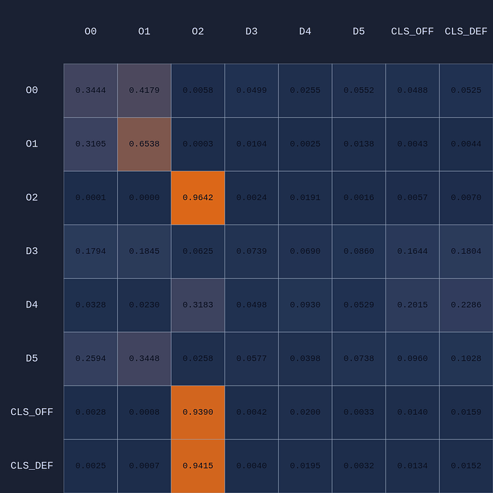 So a couple of cool things have happened. The first and most obvious result of this move is that it opened up O2 for a much more efficient shot (EP=1.08 vs 0.86 previously) and now the highest probability action for O1 is a pass to O2. This policy change is clearly evident in the attention map as we see O1→O2 has suddenly “lit up”. In fact, O1 is now paying more attention to O2 than to itself. Conversely, D5 is now paying relatively more attention to O0 and less to O2 than before, although on average all the defenders are paying high levels of attention to the open shooter compared to their own defensive assignments. There’s something else that’s interesting here…spot it yet? Notice that when D5 moves over to “help” on O0, D4→O1 actually decreases by roughly 50%. Attention is conserved across rows so if more attention is given to one player it must be taken away from some other players!