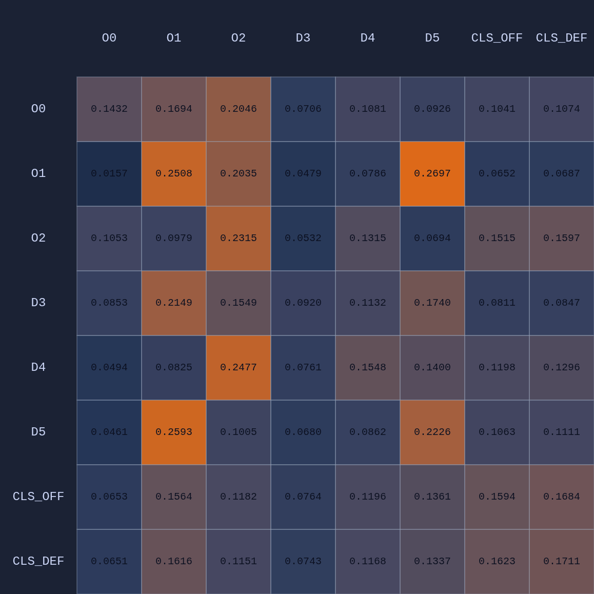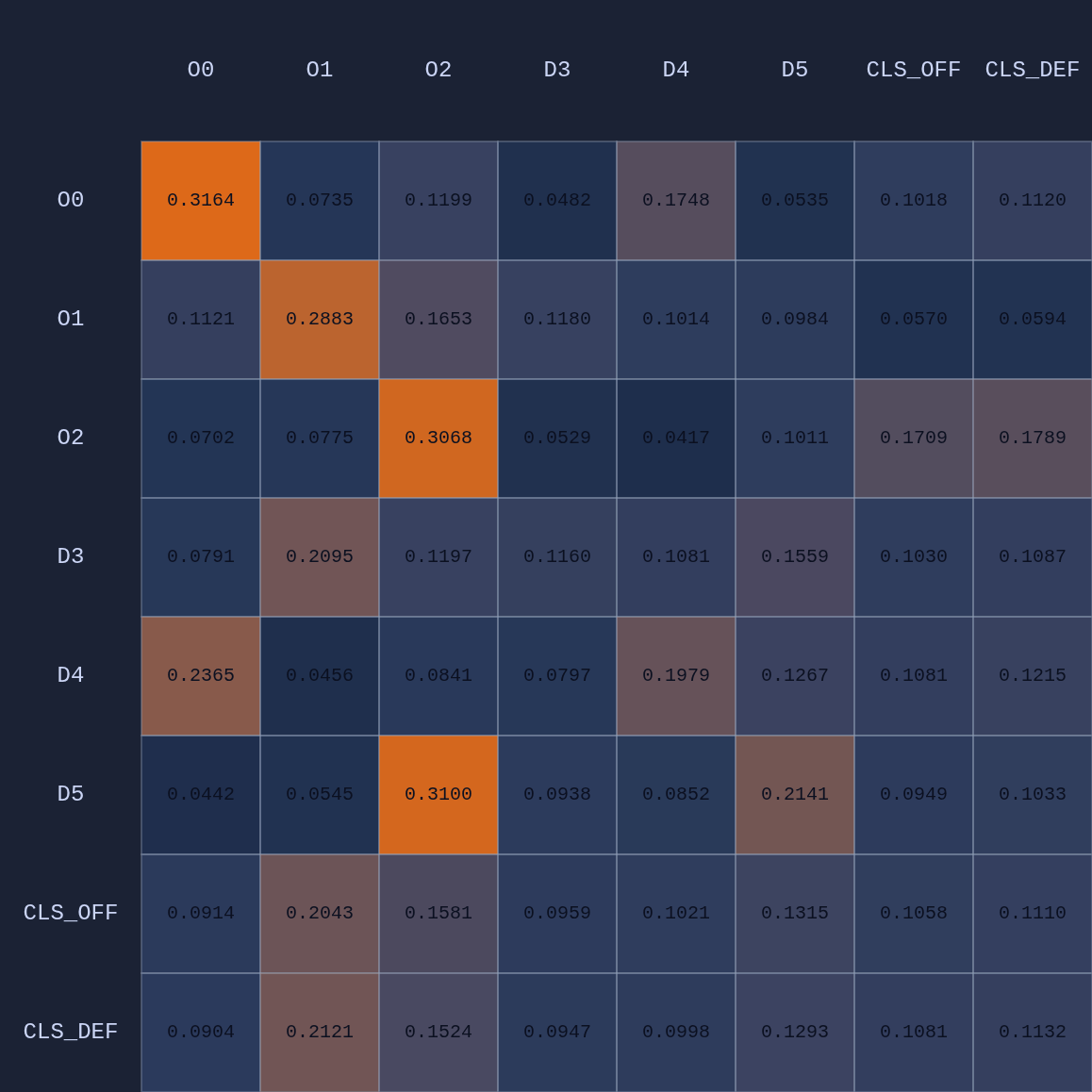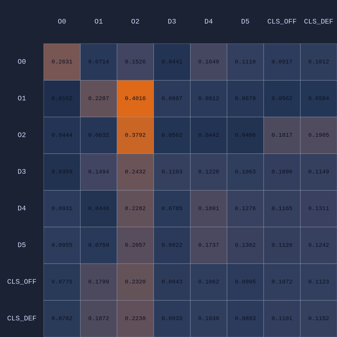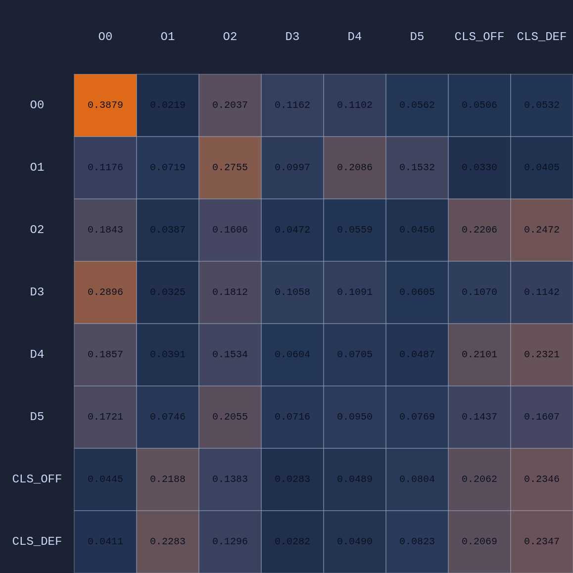 So a couple of cool things have happened. The first and most obvious result of this move is that it opened up O2 for a much more efficient shot (EP=1.08 vs 0.86 previously) and now the highest probability action for O1 is a pass to O2. This policy change is clearly evident in the attention map as we see O1→O2 has suddenly “lit up”. In fact, O1 is now paying more attention to O2 than to itself. Conversely, D5 is now paying relatively more attention to O0 and less to O2 than before, although on average all the defenders are paying high levels of attention to the open shooter compared to their own defensive assignments. There’s something else that’s interesting here…spot it yet? Notice that when D5 moves over to “help” on O0, D4→O1 actually decreases by roughly 50%. Attention is conserved across rows so if more attention is given to one player it must be taken away from some other players!