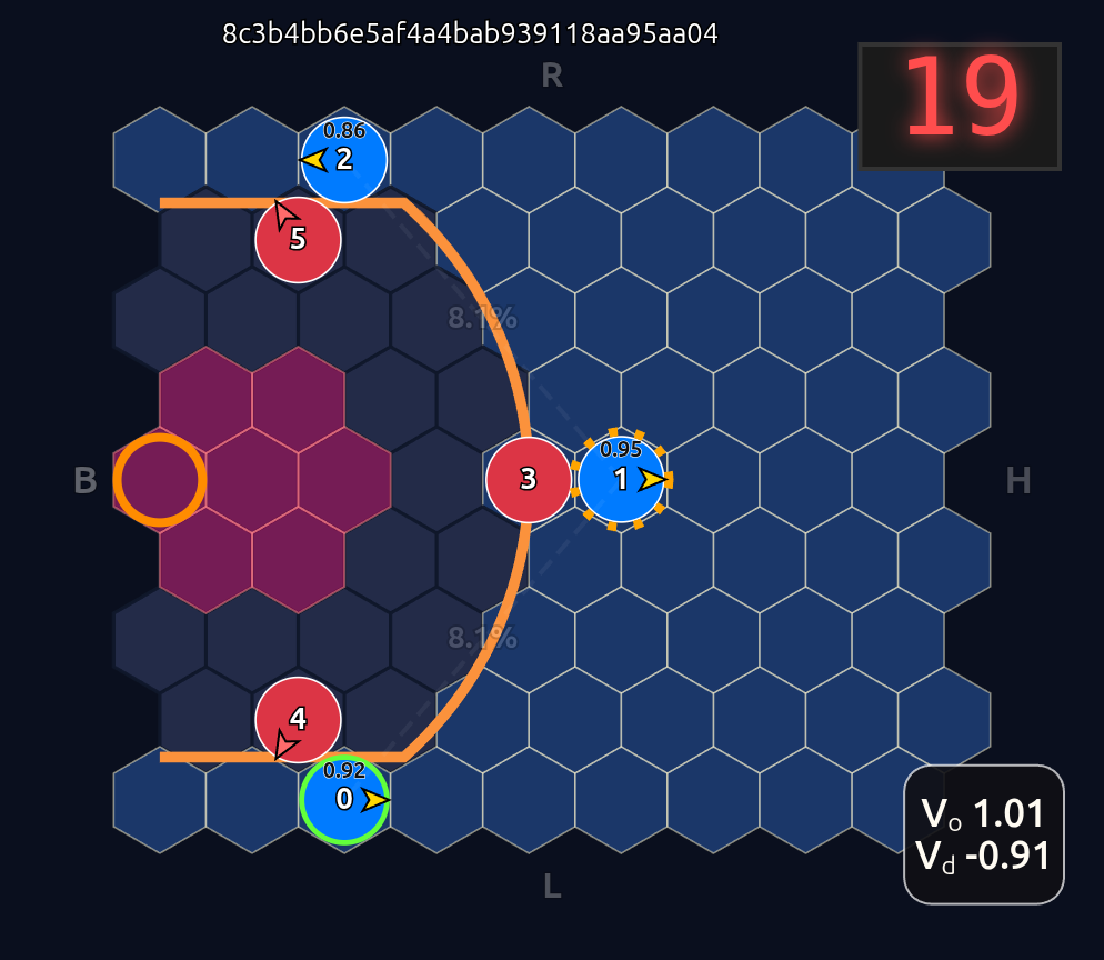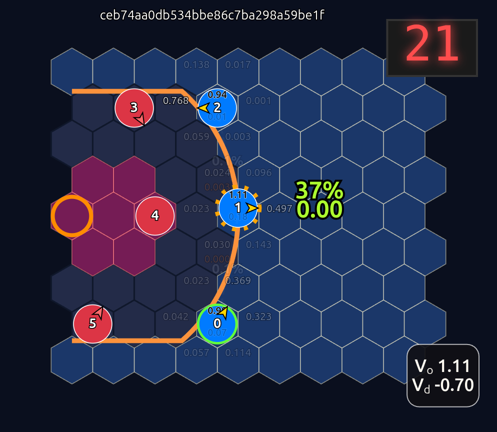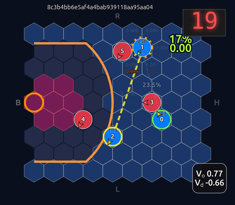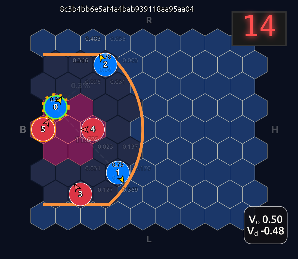 Note how the action probabilities for each agent and value function (lower right) is identical before and after the swap of positions. This is because aside from swapping their ids, the game state is unchanged otherwise.