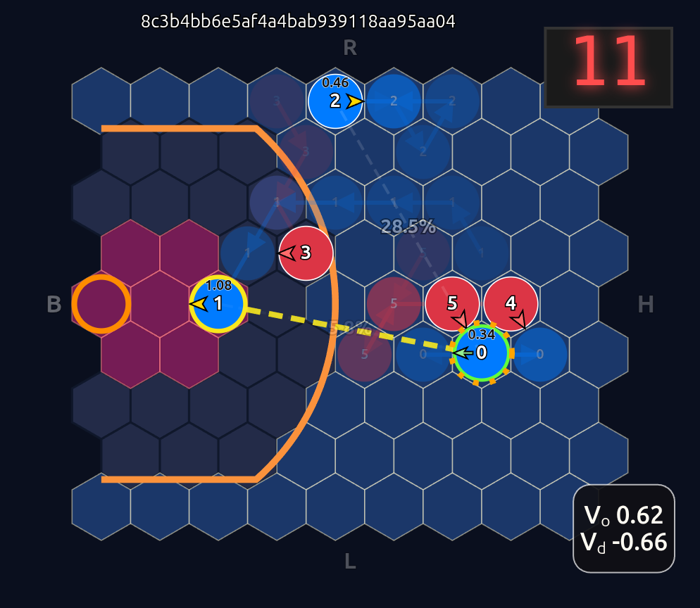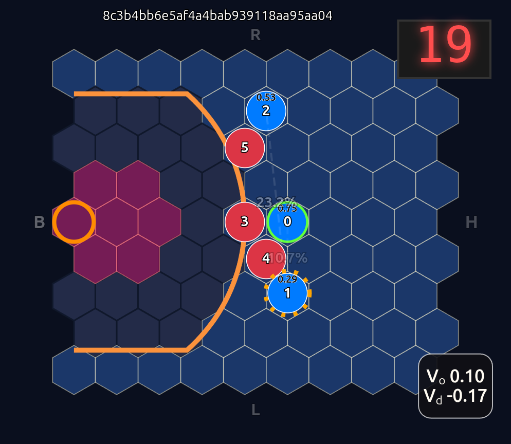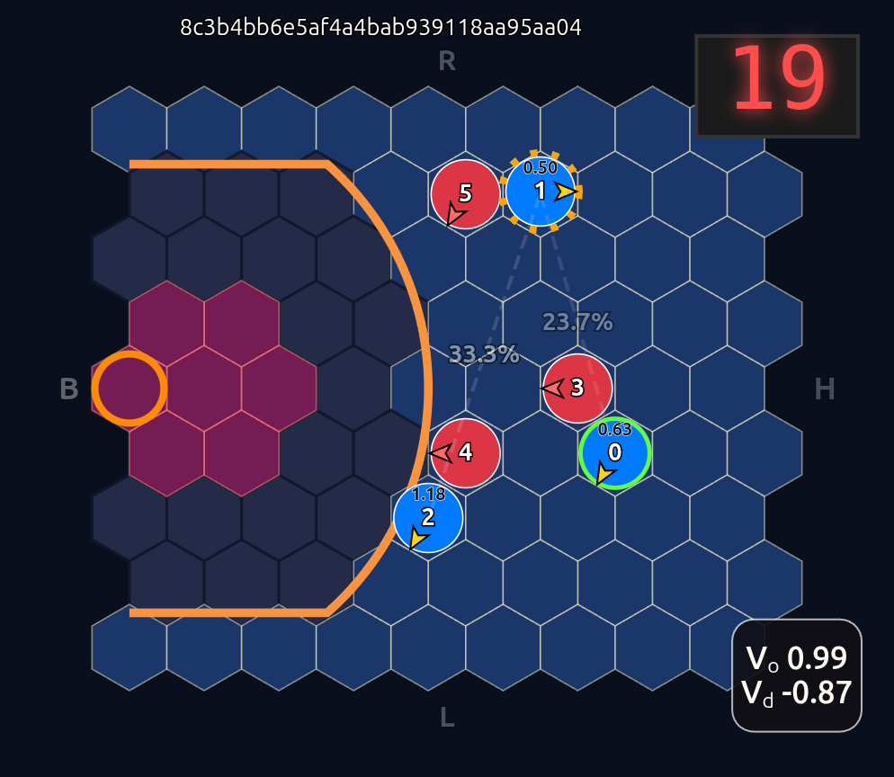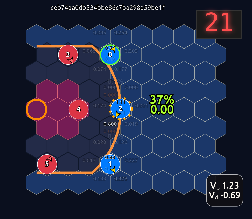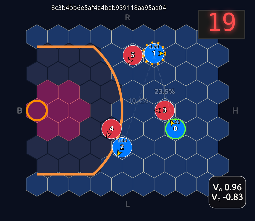 Note how the action probabilities for each agent and value function (lower right) is identical before and after the swap of positions. This is because aside from swapping their ids, the game state is unchanged otherwise.