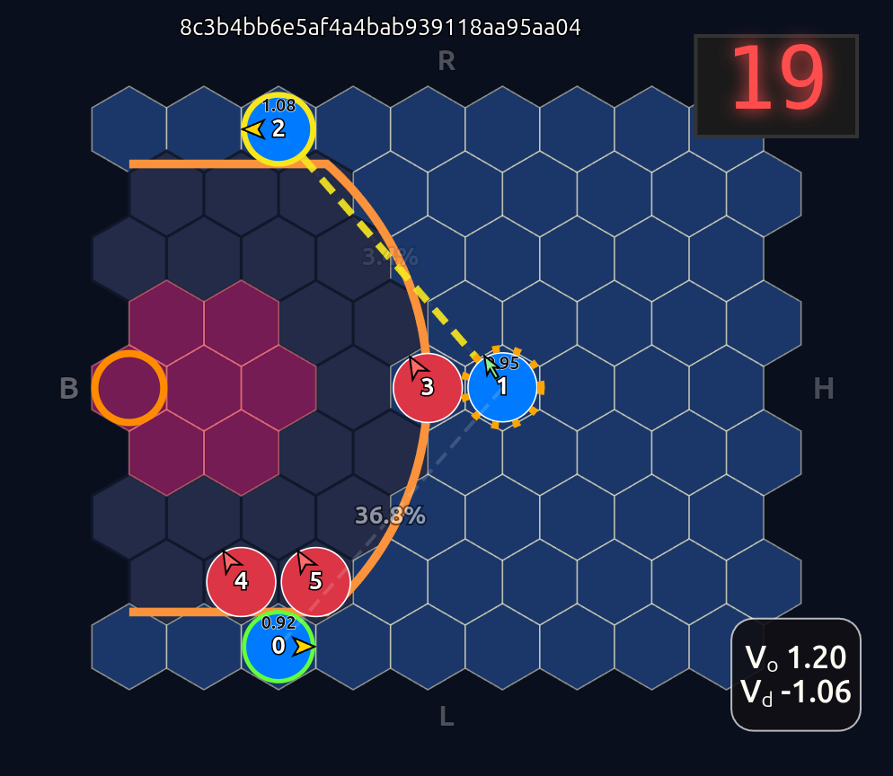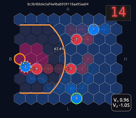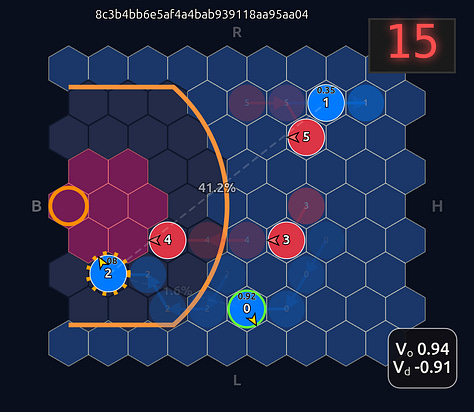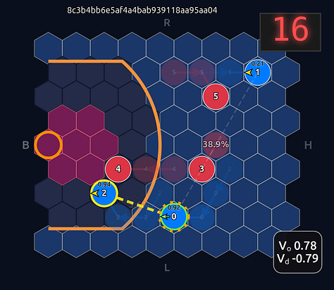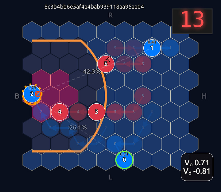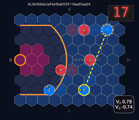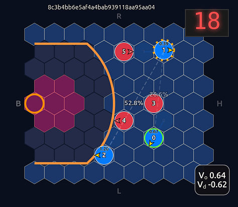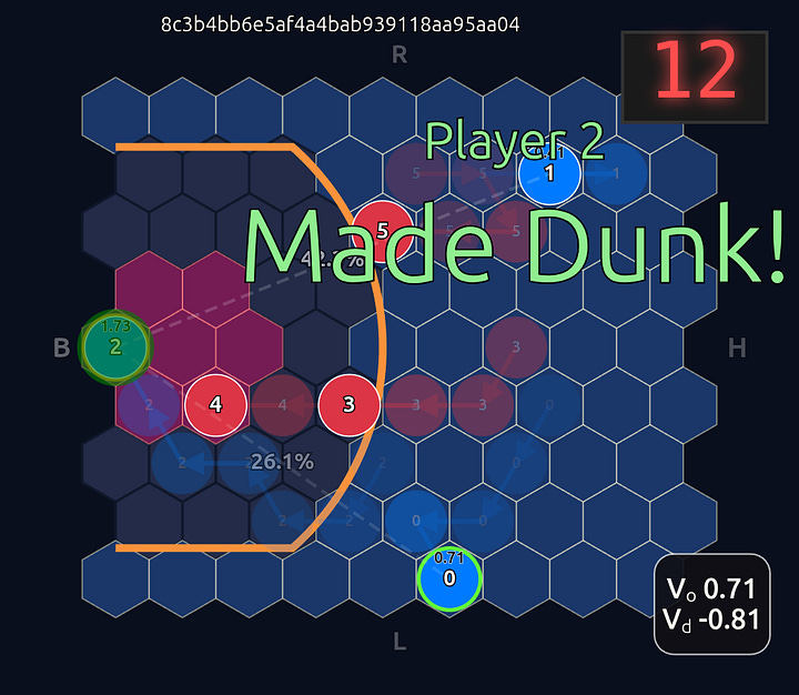 This is an 18-dimensional vector where the first 12 dimensions encode the normalized axial (q, r) coordinates for each player and the last 6 dimensions are the OHE for the ball handler. In this example, the offensive agent “#2” or O2 (zero-indexed) has the ball. This encoding seems harmless enough, but consider that there is a neural network (NN) behind the scenes that is trying to learn the importance or weight of each feature. In this architecture each “slot” in the input space is given some weight that is learned during a training run. The problem that arises is that the model will inevitably violate an implicit physical assumption I had in mind which is positional invariance (not to be confused with “positionless basketball”!). In plain language it shouldn’t matter which agent or id is in which “slot”. The model shouldn’t care whether “Agent 2” or “Agent 1” has the ball if they are in the exact same position on the court and the game state is otherwise exactly the same. This was the “experiment” I was performing in the Substack Note above. I noticed that if I swapped positions of the agents I got significantly different policy probabilities ceteris paribus —even if everything else was held constant (coordinates, shooting skills, etc). The model was violating positional invariance. You can see this in the screenshots here where I’ve swapped players keeping everything else the same: