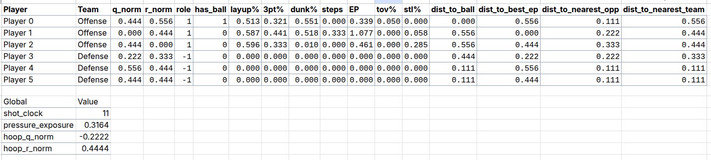 With this simple twist we can now also employ multiple attention heads to learn different higher level BasketWorld features. In the very literal sense of the word, the idea here is that the model learns to pay attention to game states such as “who has the ball”, “who is the nearest defender to me”, “how much time is left on the shot clock?”, via self-attention and cross-attention. You might be wondering at this point how it can learn all that based on the example observations above where we just had position and ball-handler encoding, but of course, our actual BW environment has a lot more state detail. Here is a real instance of a game statet taken from an episode of game play: